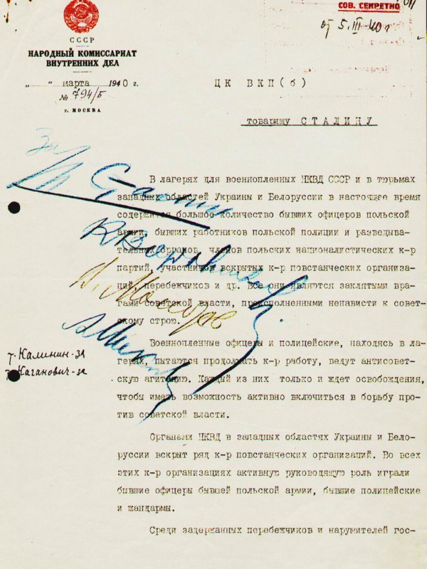 Decyzja o rozstrzelaniu polskich jeńców z 5 marca 1940. Podpisy Stalina, Woroszyłowa, Mołotowa i Mikojana. Kalinin i Kaganowicz "za"