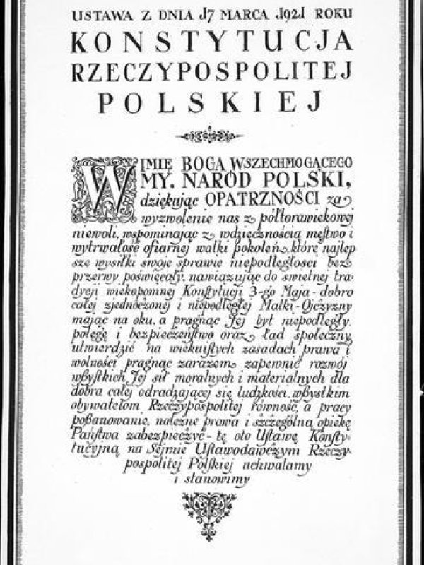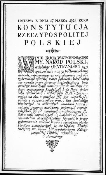 W Imię Boga Wszechmogącego! My, Naród Polski, dziękując Opatrzności za wyzwolenie nas z półtorawiekowej niewoli, wspominając z wdzięcznością męstwo i wytrwałość ofiarnej walki pokoleń, które najlepsze wysiłki swoje sprawie niepodległości bez przerwy poświęcały, nawiązując do świetnej tradycji wiekopomnej Konstytucji 3-go Maja – dobro całej, zjednoczonej i niepodległej Matki-Ojczyzny mając na oku, a pragnąc Jej byt niepodległy, potęgę i bezpieczeństwo oraz ład społeczny utwierdzić na wiekuistych zasadach prawa i wolności, pragnąc zarazem zapewnić rozwój wszystkich Jej sił moralnych i materialnych dla dobra całej odradzającej się ludzkości, wszystkim obywatelom Rzeczypospolitej równość, a pracy poszanowanie, należne prawa i szczególną opiekę Państwa zabezpieczyć – tę oto Ustawę Konstytucyjną na Sejmie Ustawodawczym Rzeczypospolitej Polskiej uchwalamy i stanowimy.