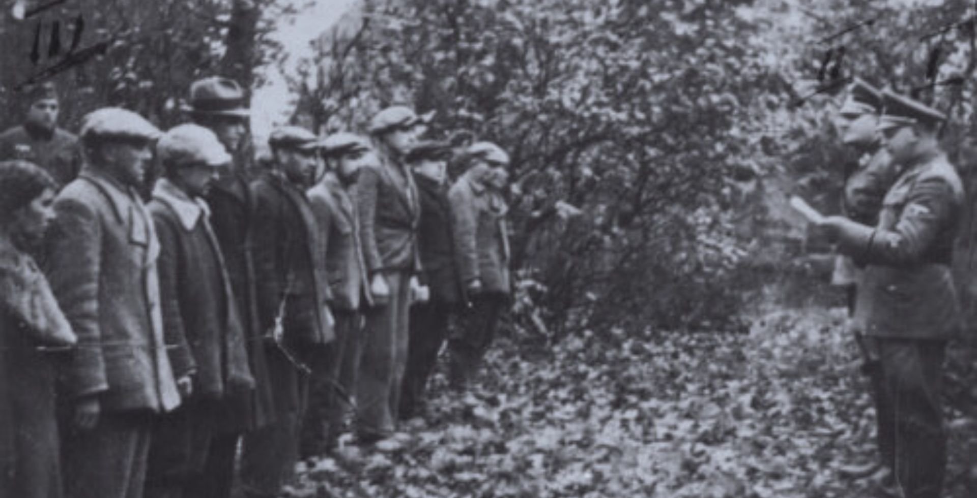 Szubin, 21 X 1939 r. Tuż przed egzekucją. Dwóch oficerów SS (jeden z nich to SS-Sturmbannführer Ernest Tiedemann) odczytuje wyrok śmierci grupie Polaków (fot. z zasobu IPN)